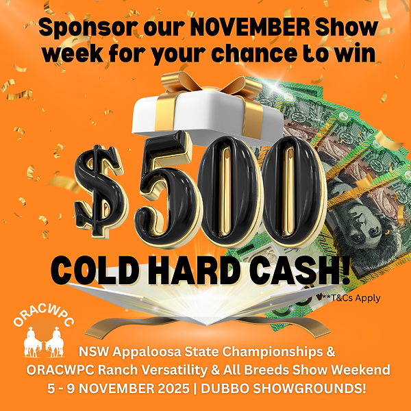 Contact us today to become a sponsor and secure your entry in the big cash draw. • Email: oracwpclub@gmail.com • Direct Message: Our Club or Show Facebook Page We can’t wait to see you at the show and announce our lucky winner!